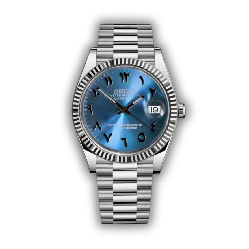 Introducing the DateJust Navy Blue, a custom Seiko NH35 Automatic Watch inspired by the iconic DateJust design, meticulously crafted for those who seek elegance and precision. This model features a Navy Blue Sunburst aftermarket dial and a transparent back piece, allowing a glimpse into the intricate automatic movement.